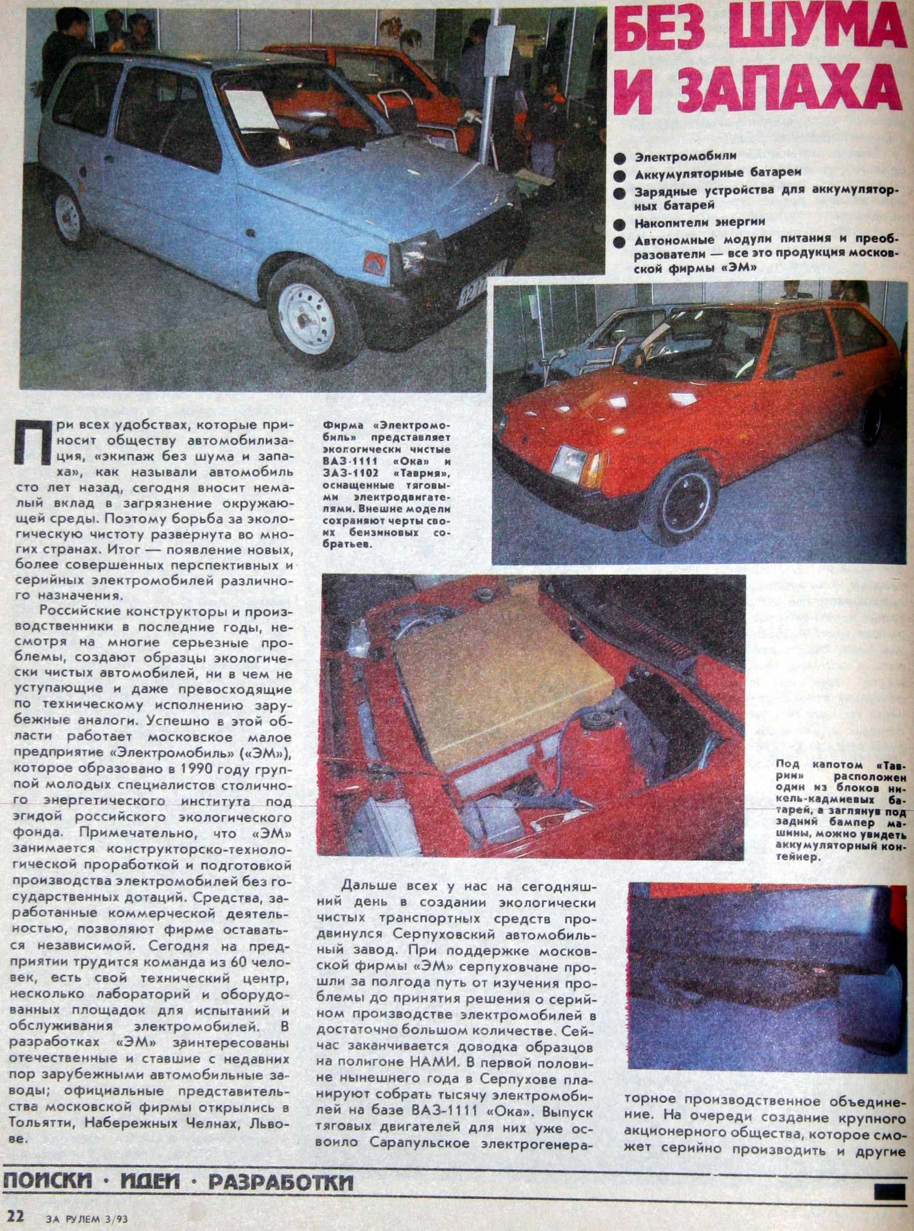 Дальше всех у нас на сегодняшний день в создании экологически чистых транспортных средств продвинулся Серпуховский автомобильный завод. При поддержке московской фирмы «ЭМ» серпуховчане прошли за полгода путь от изучения проблемы до принятия решения о серийном производстве электромобилей в достаточно большом количестве. Сейчас заканчивается доводка образцов на полигоне НАМИ. В первой половине нынешнего года в Серпухове планируют собрать тысячу электромобилей на базе ВАЗ-1111 «Ока». Выпуск тяговых двигателей для них уже освоило Сарапульское электрогенераторное производственное объединение. На очереди создание крупного акционерного общества, которое сможет серийно производить и другие опытные образцы « Электромобиля», заниматься и реализацией.