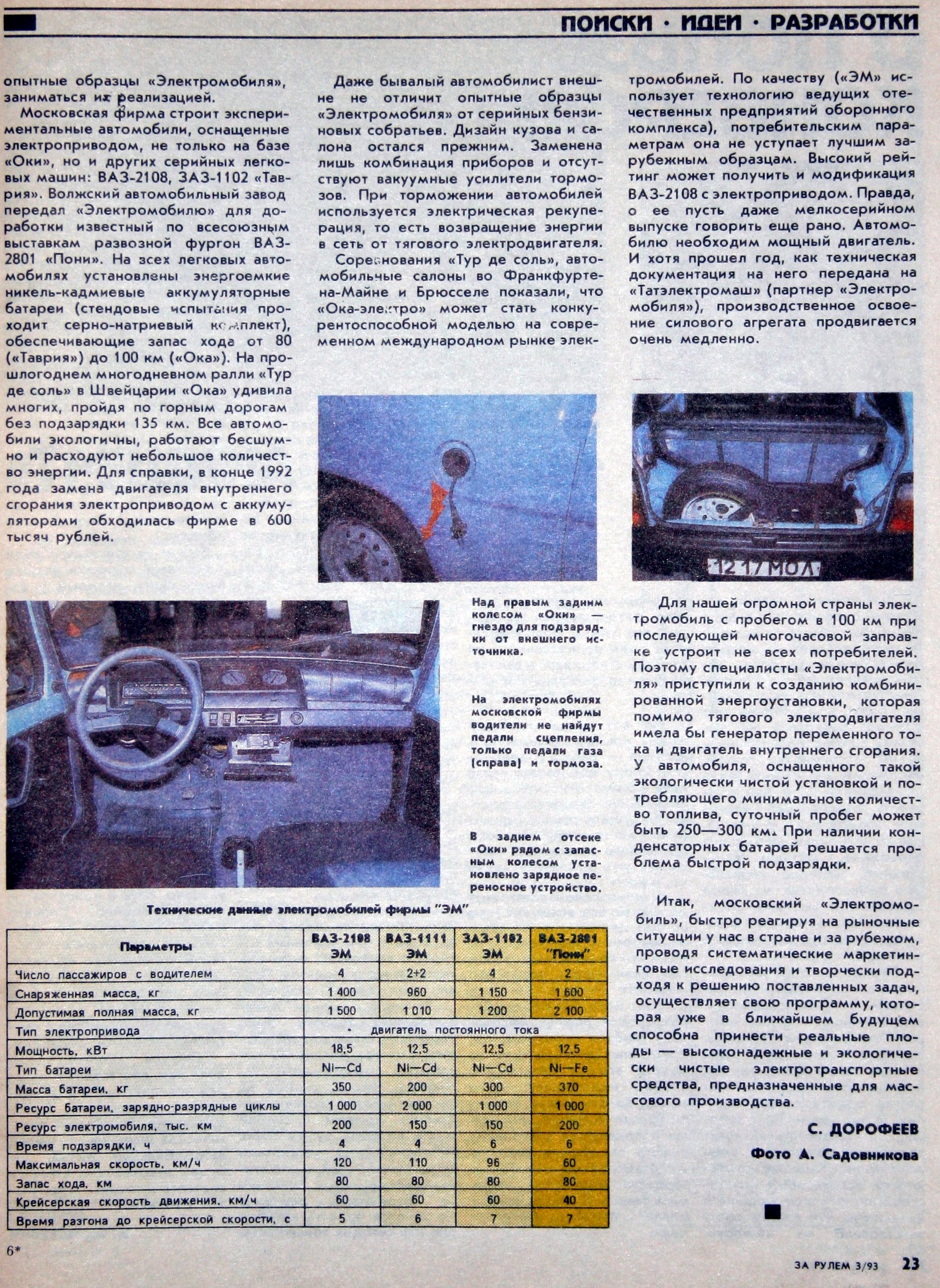 Московская фирма строит экспериментальные автомобили, оснащенные электроприводом, не только на базе «Оки», но и других серийных легковых машин: ВАЗ-2108, ЗАЗ-1102 «Таврия». Волжский автомобильный завод передал «Электромобилю» для доработки известный по всесоюзным выставкам развозной фургон ВАЗ-2801 «Пони». На всех легковых автомобилях установлены энергоемкие никель-кадмиевые аккумуляторные батареи (стендовые испытания проходит серно-натриевый комплект), обеспечивающие запас хода от 80 («Таврия») до 100 км («Ока»). На прошлогоднем многодневном ралли «Тур де соль» в Швейцарии «Ока» удивила многих, пройдя по горным дорогам без подзарядки 135 км. Все автомобили экологичны, работают бесшумно и расходуют небольшое количество энергии. Для справки, в конце 1992 года замена двигателя внутреннего сгорания электроприводом с аккумуляторами обходилась фирме в 600 тысяч рублей.