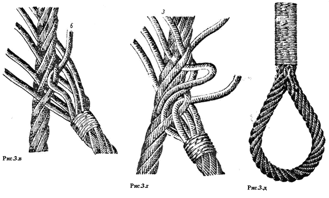 Затем необходимо вновь перевернуть огон, придав ему первоначальное положение, и пробить в трос шестую ходовую прядь. Она вводится под одну прядь троса по направлению его спуска (рис. 3.в, прядь 6). Этим завершается первая пробивка.