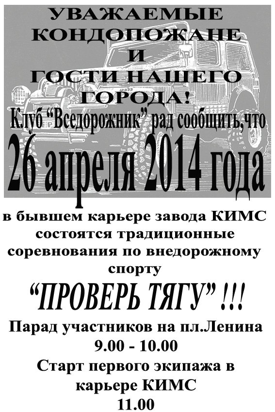 Открытый чемпионат города Кондопога по внедорожному спорту состоится 26-27 апреля 2014 года! Ура, товарищи!