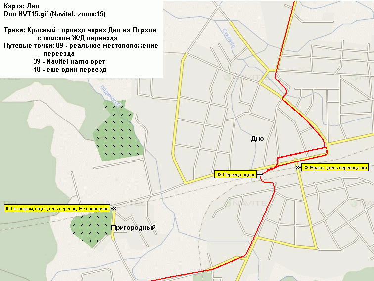 красный – проезд через Дно на Порхов с поиском Ж/Д переезда